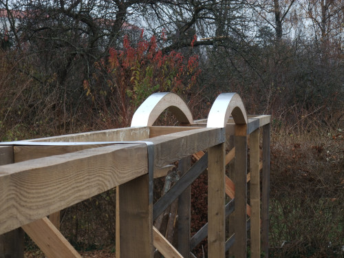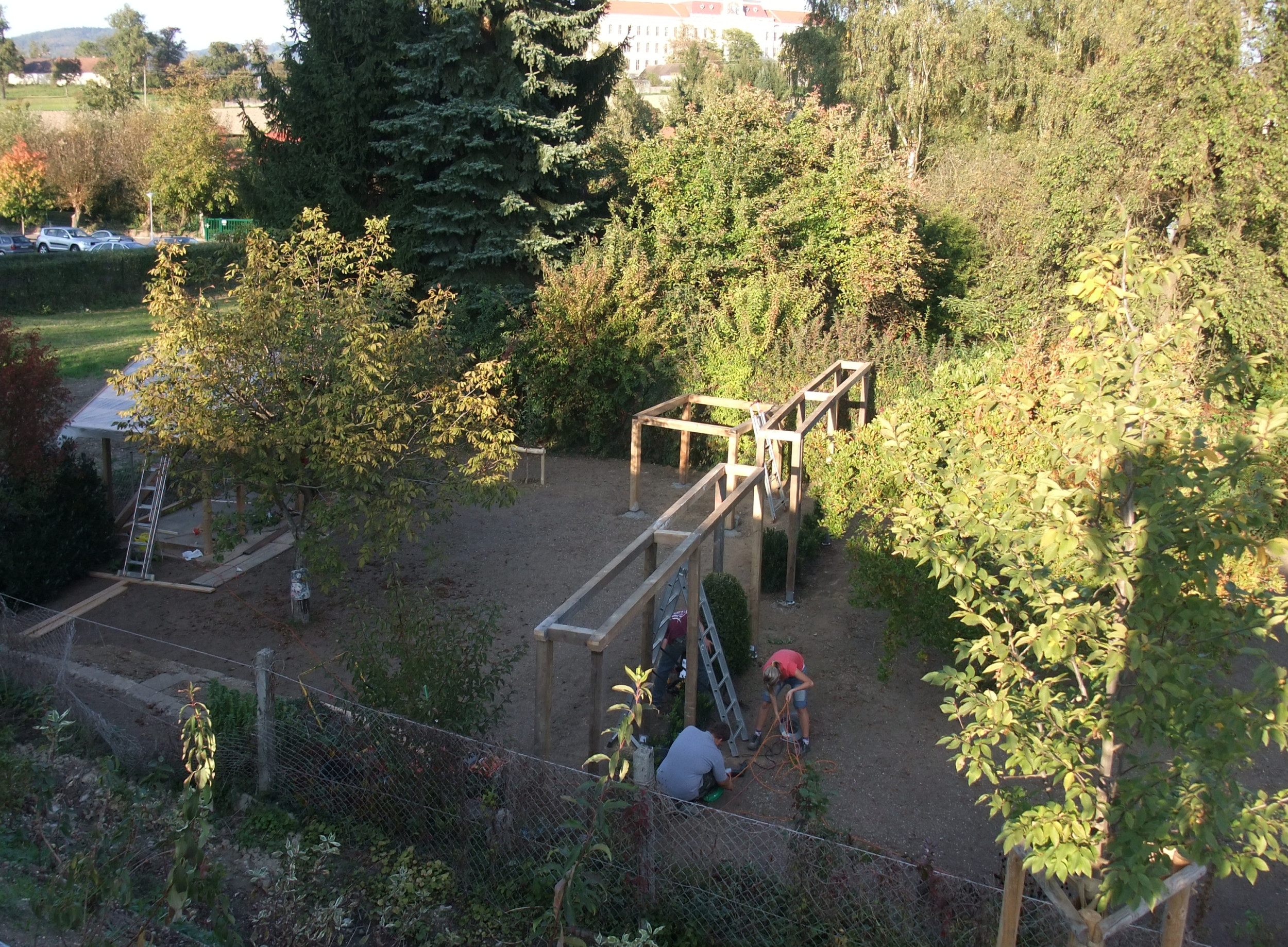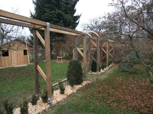 Der Blick in den hinteren Gartenteil macht neugierig, was sich hinter dem Verbindungselement noch versteckt. Gleichzeitig gliedert es den Garten in Wohngarten und Nutzgarten.