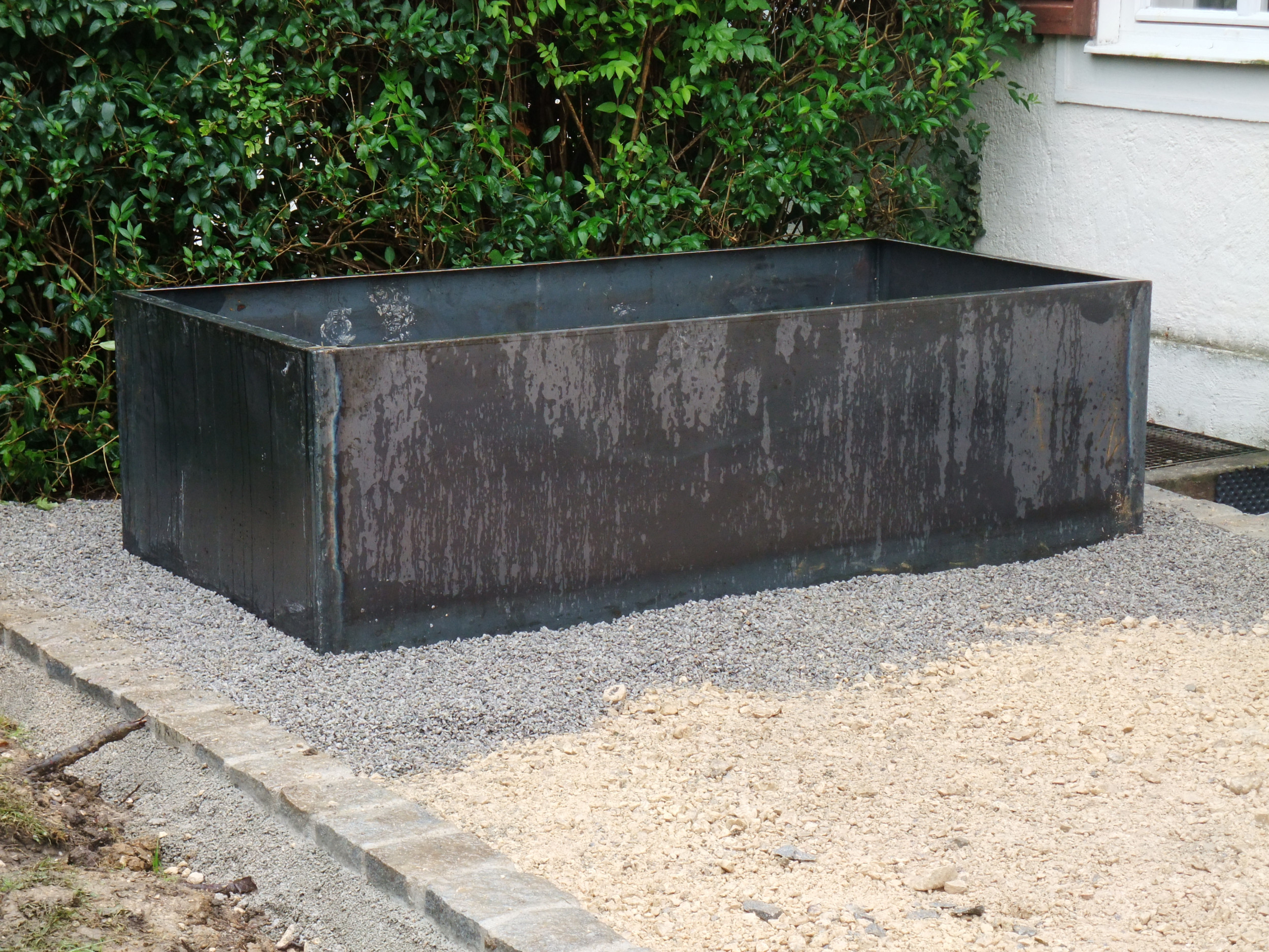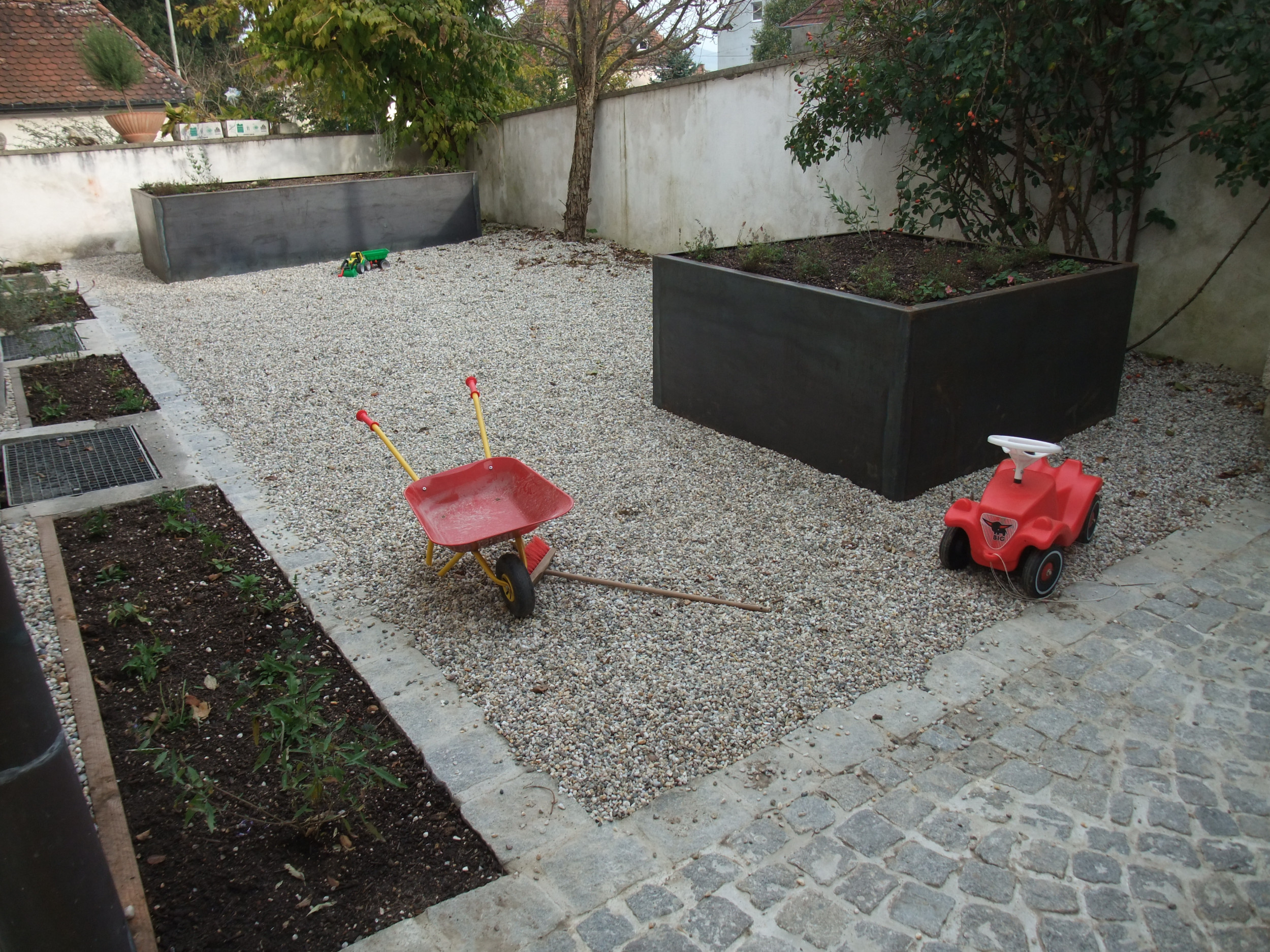 Das wunderschöne Doppelhaus im englischen Landhausstil wurde durch Pflaster und Kiesflächen rund ums Haus hervorgehoben, die Länge des Gartens durch das Pergolenelement noch verstärkt.