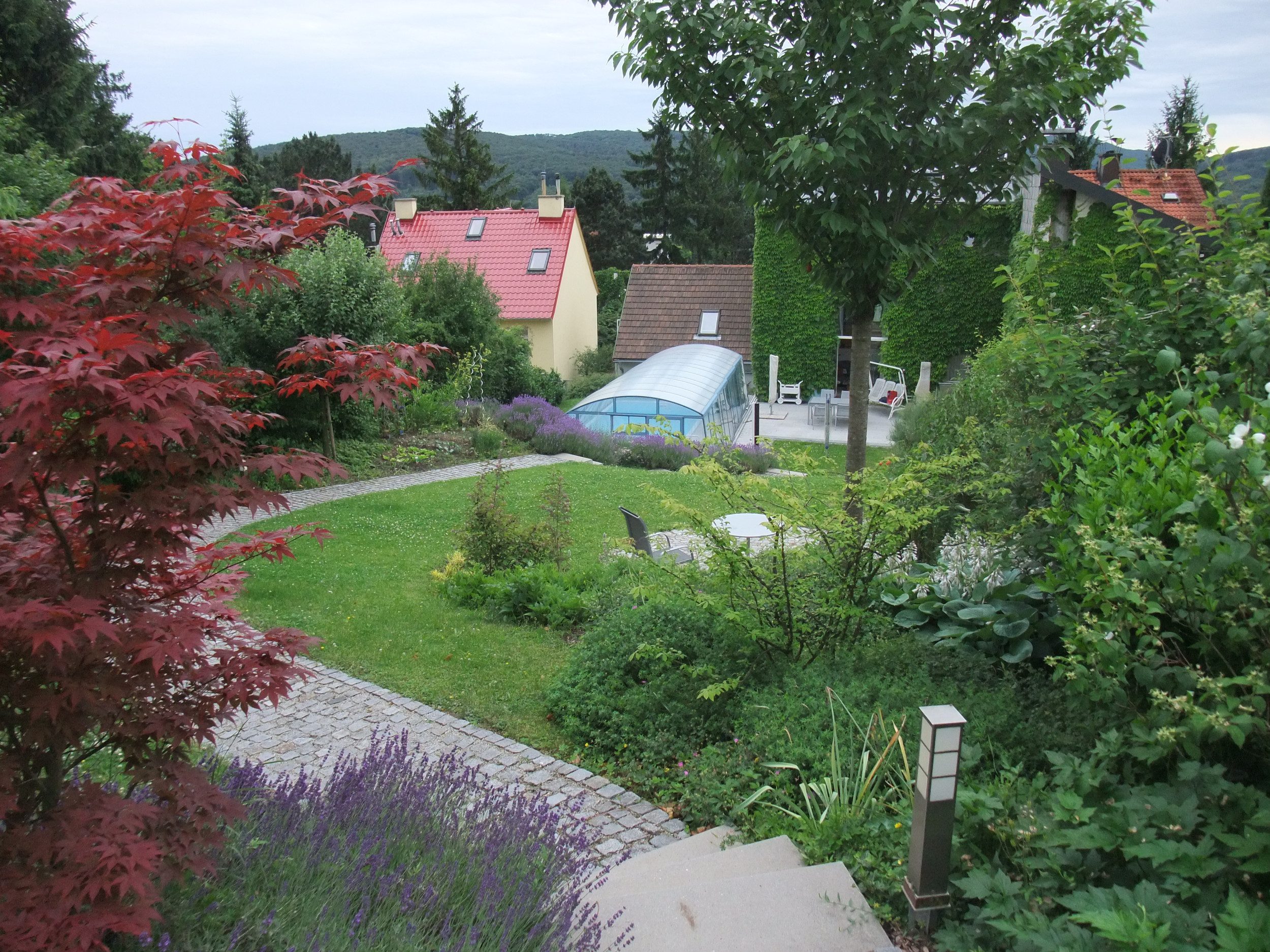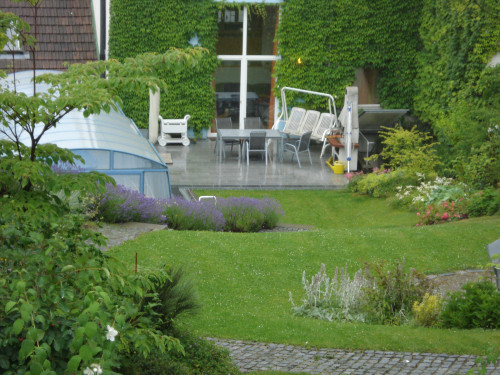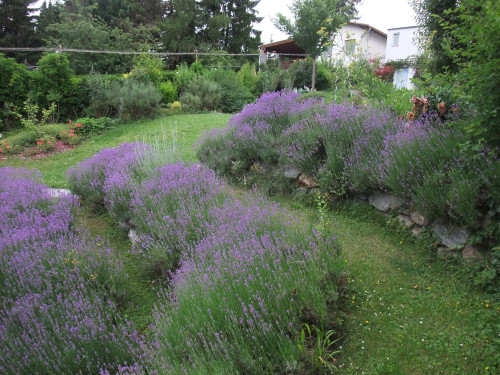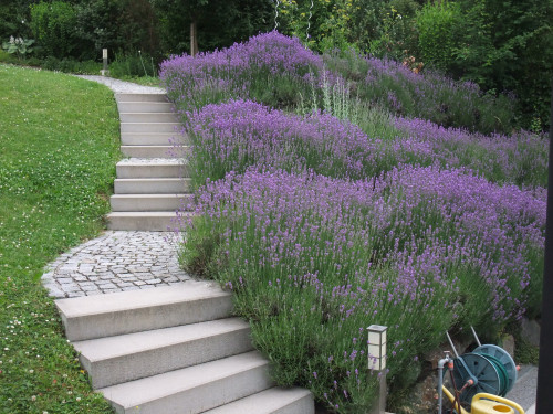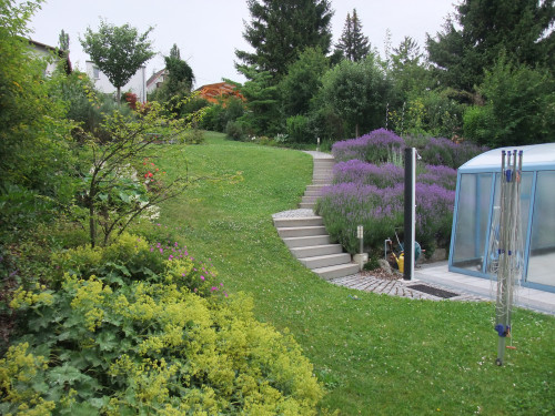 Anstelle einer massiven Stützmauer beim Schwimmbad wurden kleinere, natürliche Trockensteinmauern errichtet. Die darüber liegenden Böschungen sind mit Lavendel bepflanzt und schaffen eine mediterrane Atmosphäre.