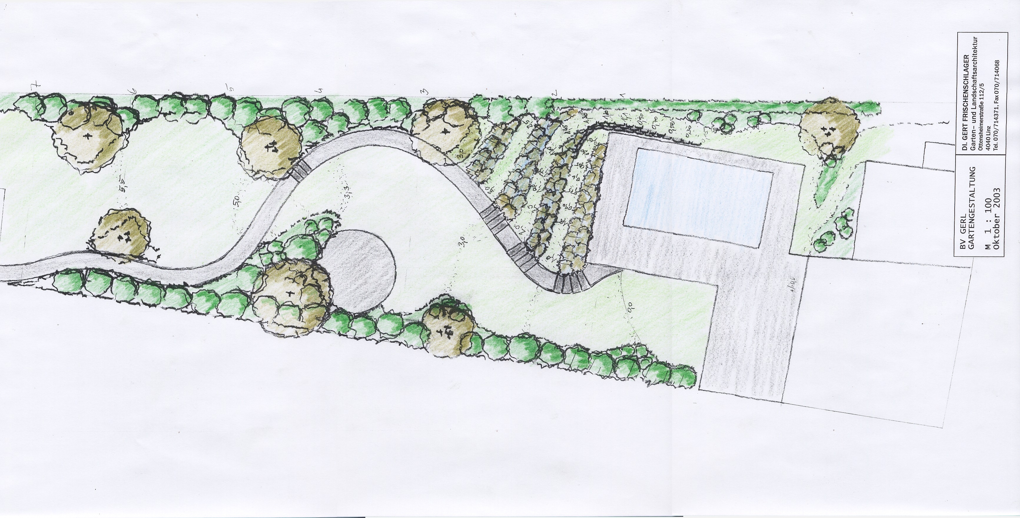 Drei geschwungene gepflasterte Wege verbinden die Ebenen mit kurzen Treppenelementen harmonisch und laden zur Erkundung des Gartens ein. Diese Gestaltung legt Wert auf Funktionalität, leichte Pflegbarkeit und die Verwendung von einheimischen Pflanzen.