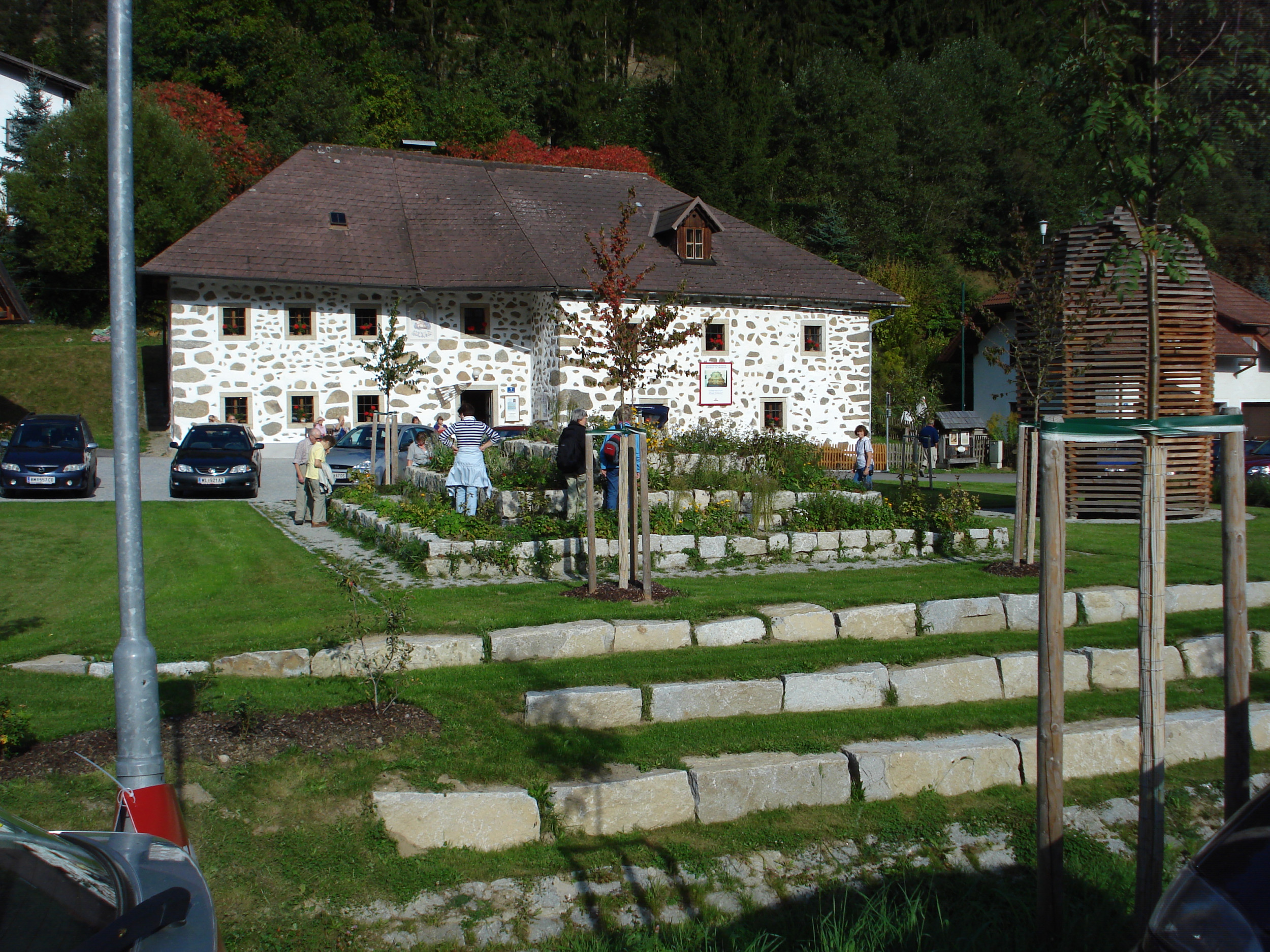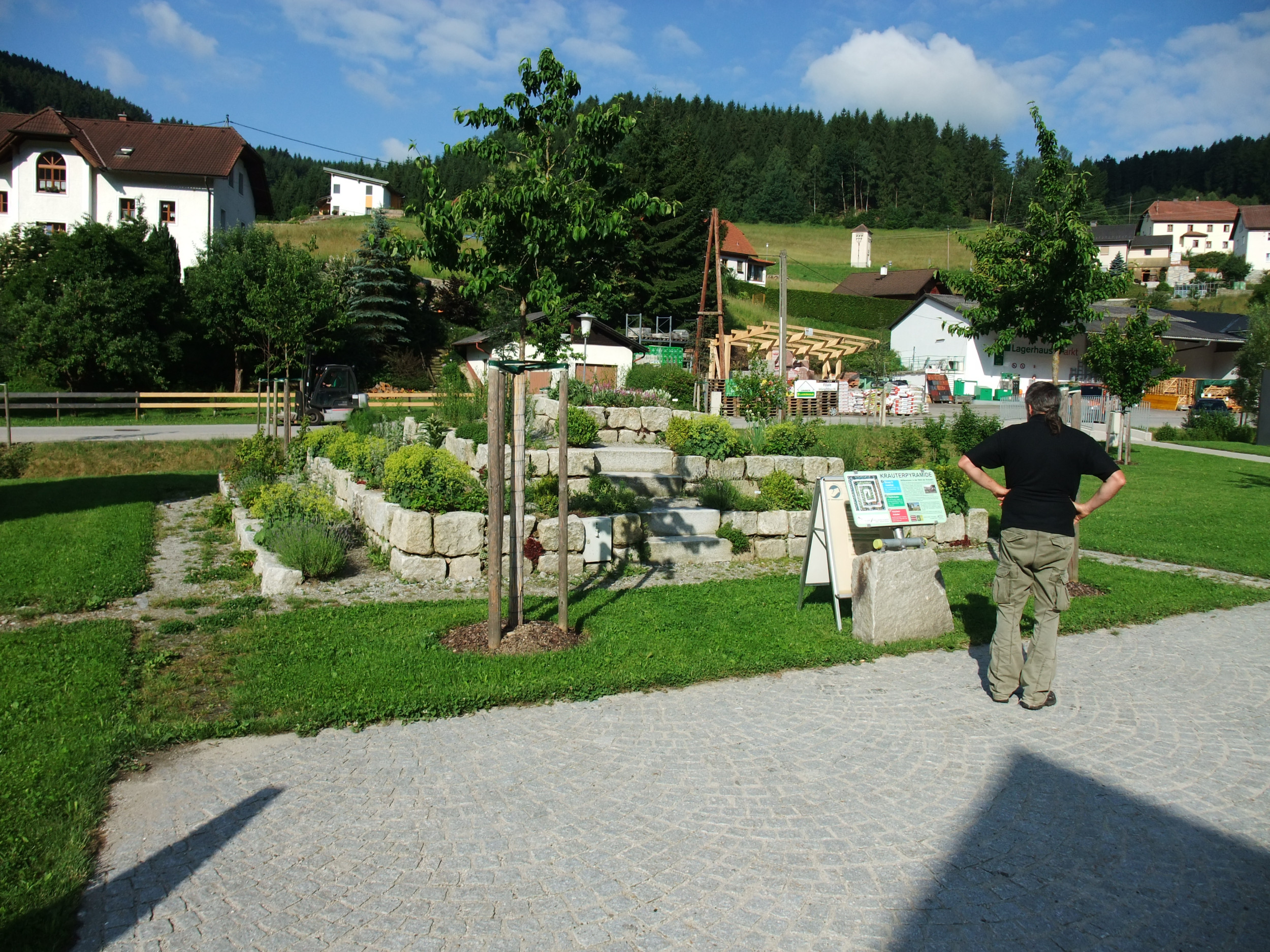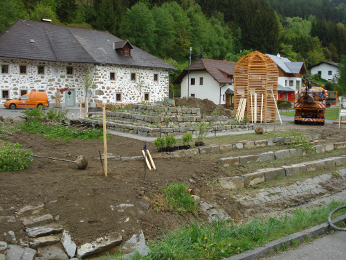 Eine großzügige Freifläche bietet Raum auch für größere Veranstaltungen und soll das regionale Dorfleben fördern. Als zentraler Punkt des Platzes entstand die „Kräuterkraftquelle“ - Kräuterpyramide. Fruchttragende Bäume, darunter vier Dirndlbäume und eine Allee aus Ebereschen, weisen auf die regionale Tradition der Schnapsherstellung hin.