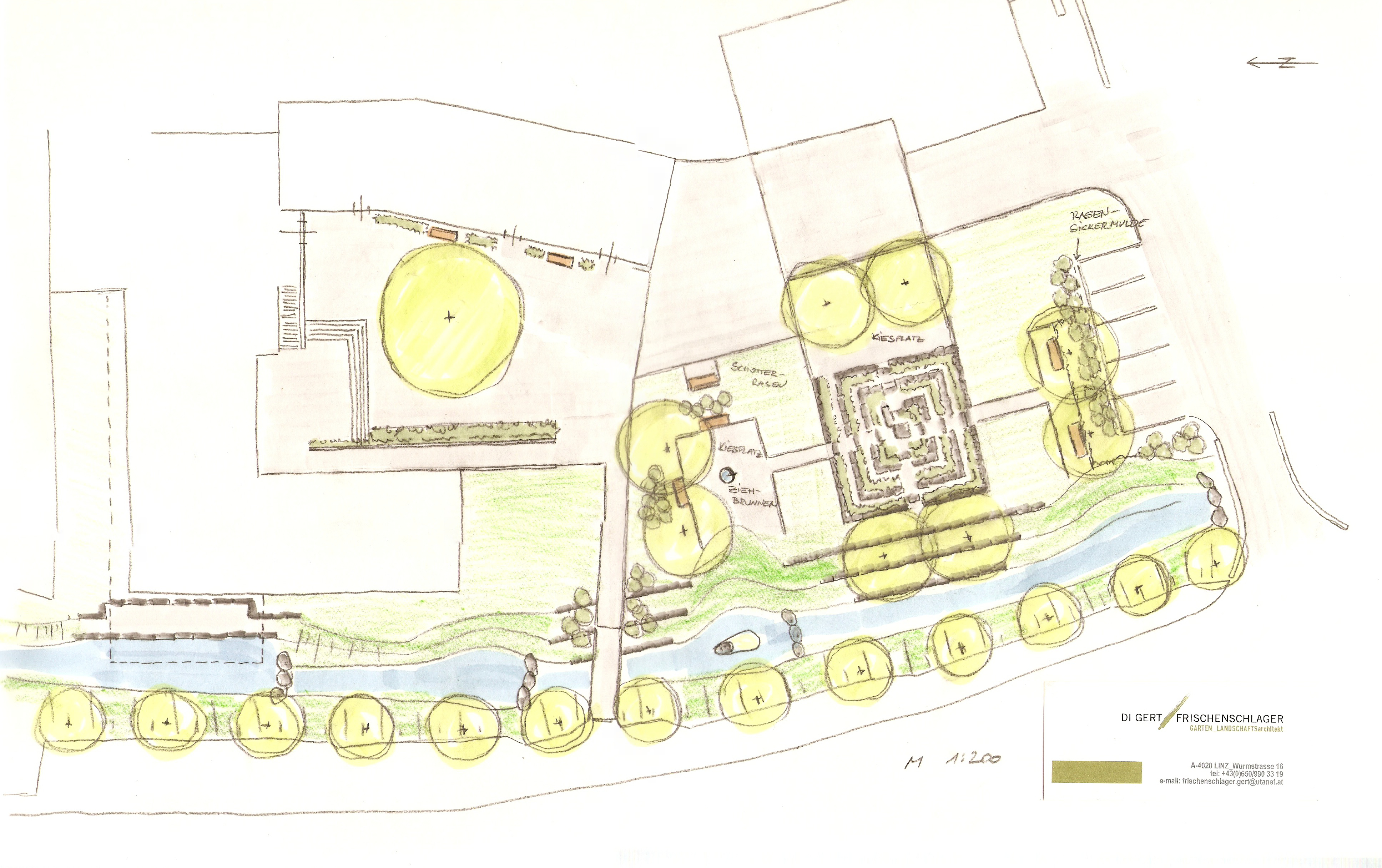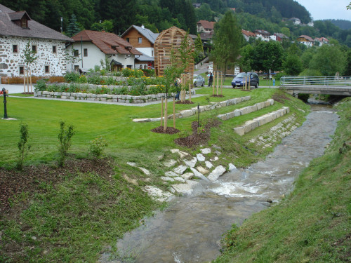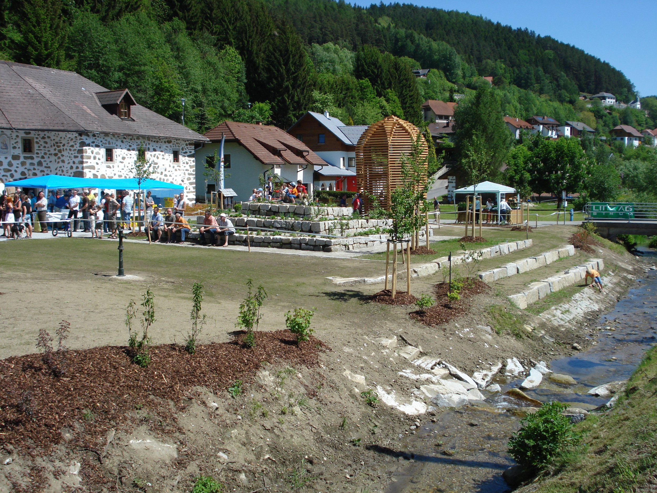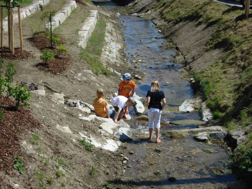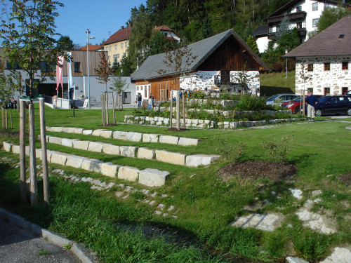 Der Flußlauf der Kleine Gusen wurde in den Platz integriert und durch Sitzstufen direkt am Bach als Erlebniswelt erschlossen.
