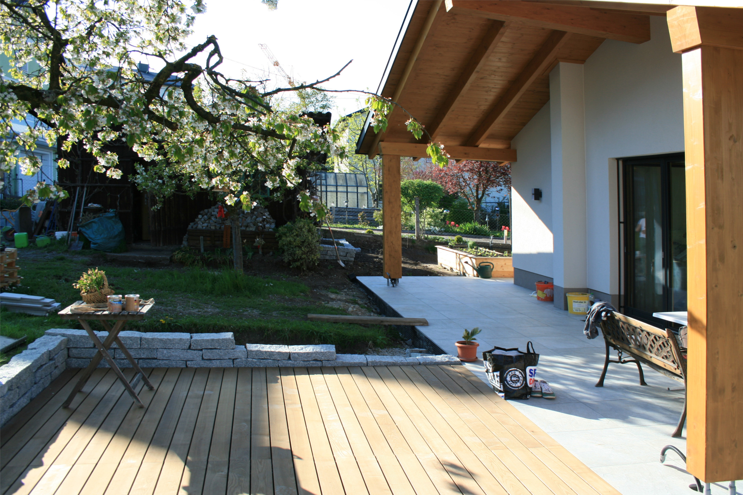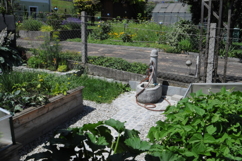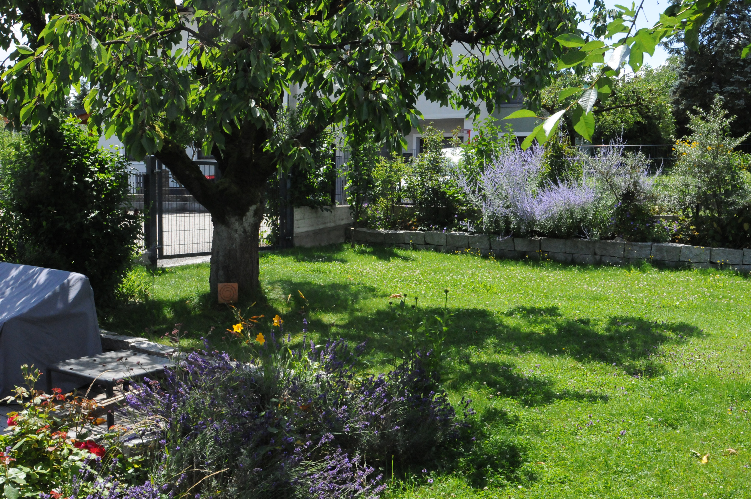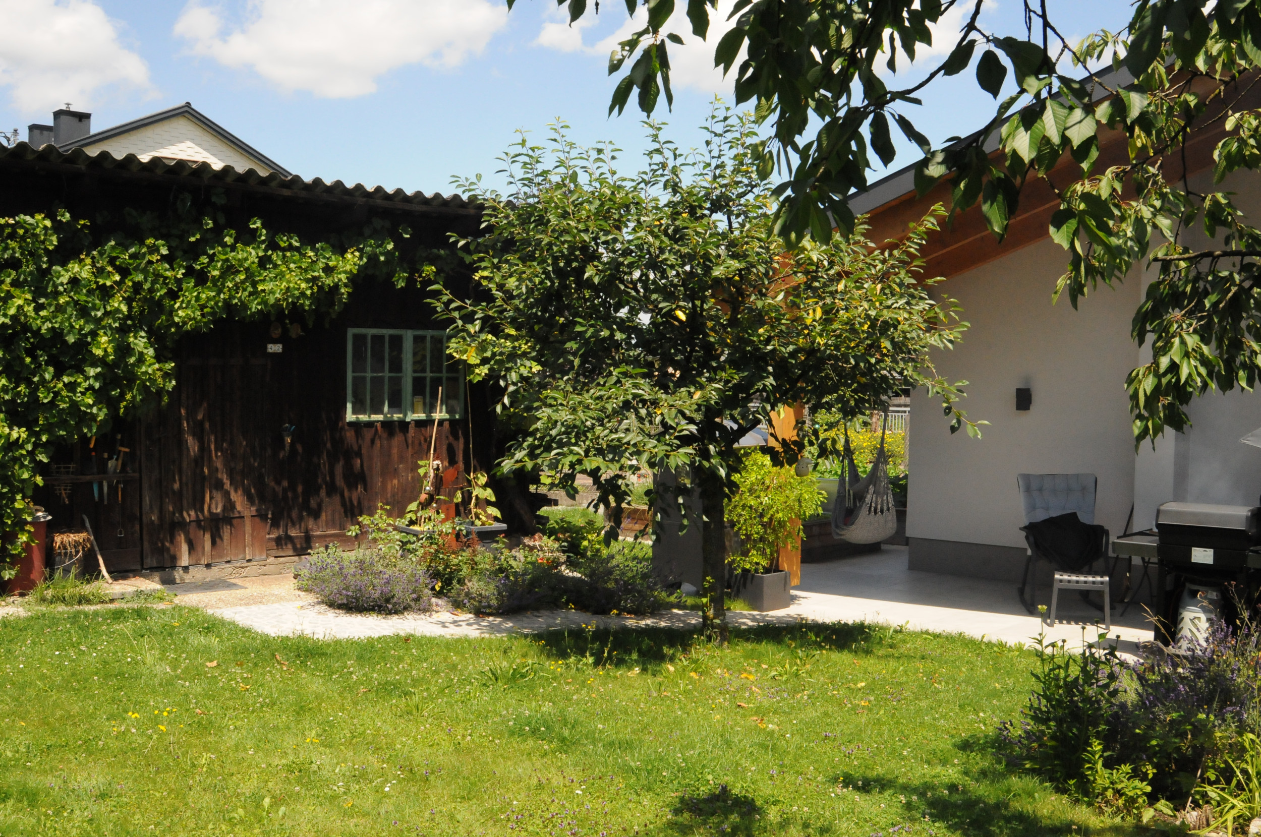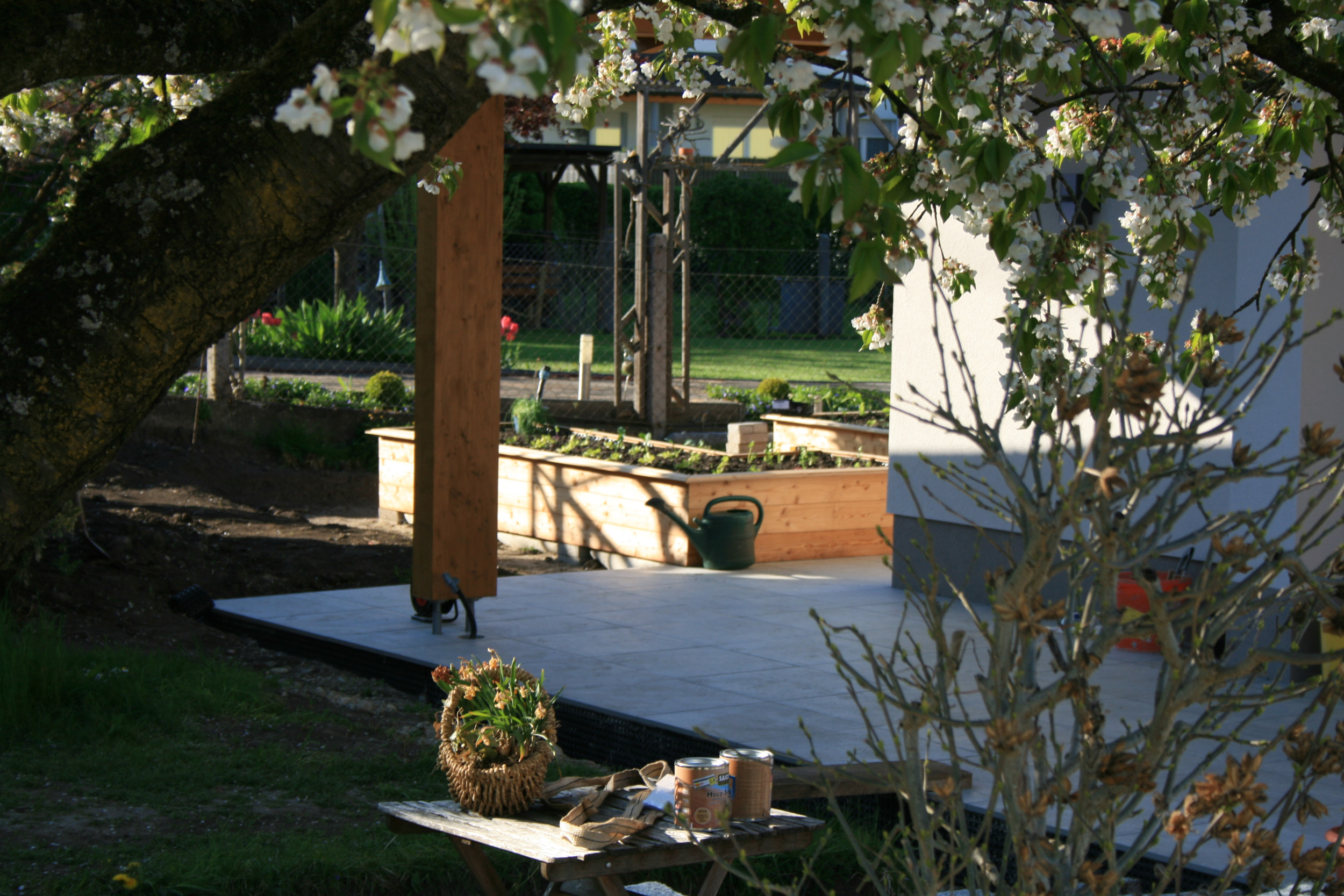 Durch die vorgegebene Ecksituation ergab sich ein idealer Platz für den Gemüsegarten mit Hochbeeten und Rankgittern. Der angrenzende Terrassenbereich lädt zum Verweilen ein und bietet einen direkten Bezug zur Gartenlandschaft. Der bestehende Baum wurde bewusst in die Terrassengestaltung integriert und dient nun als natürlicher Schattenspender sowie harmonisches Gestaltungselement.